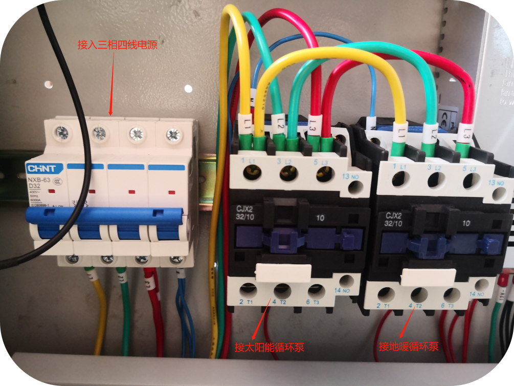 如下圖所示,安裝指示標(biāo)識(shí)正確接入線路,空氣開關(guān)依線號(hào)接入三相四線電源,交流接觸器輸出端分別接太陽能循環(huán)泵和地暖循環(huán)泵。